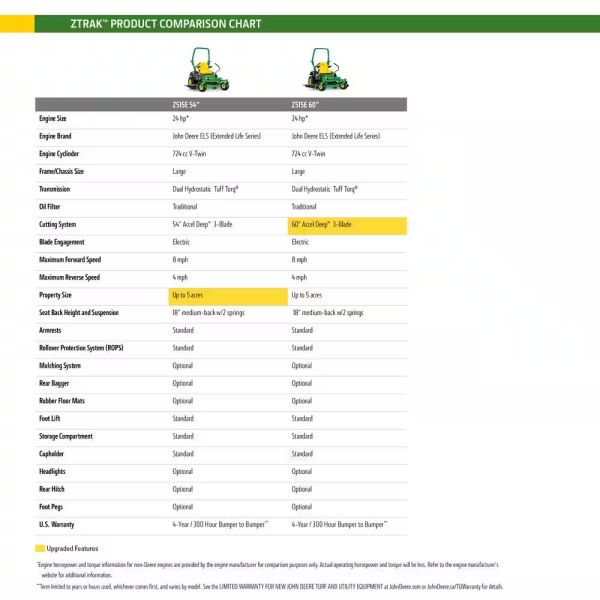 Built in Greeneville, TN, the new Z325E is designed for improved ride quality and durability with a tougher frame and large front tires. Easy to operate, the 24 HP John Deere branded V-Twin engine delivers a smooth, powerful performance. The 54-in. (137-cm) forged Accel Deep mower deck produces a superior lawn at higher mowing speeds and is easily equipped to bag or mulch.